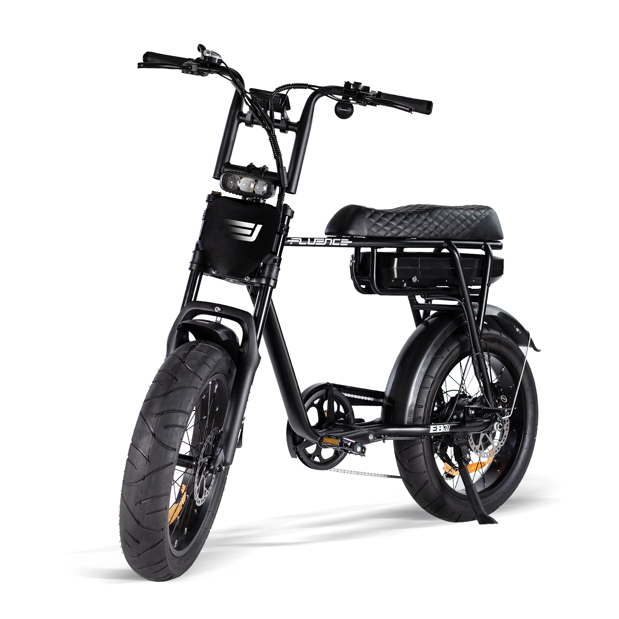 De Fluencebike EB2 wordt standaard geleverd met toonaangevende functies, waaronder een 250W/750W piekvermogen motor, 18.2AH accu, 203mm hydraulische schijfremmen, superhelder kleuren display, verbeterde voorvering instelbare motorophanging, 2-zits zadel met voetsteunen voor de duopassagier, 180kg maximale belasting en onze uitgebreide 1-jarige garantie.