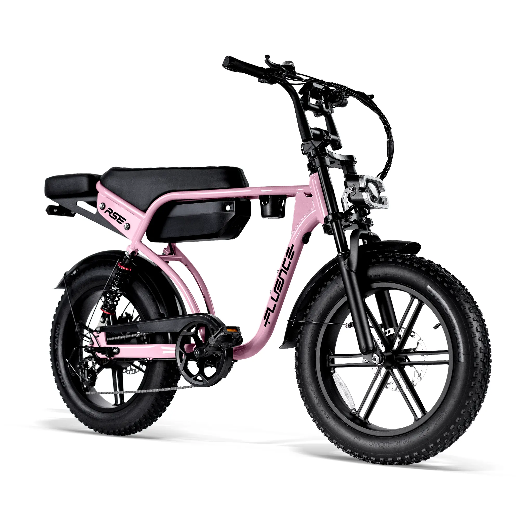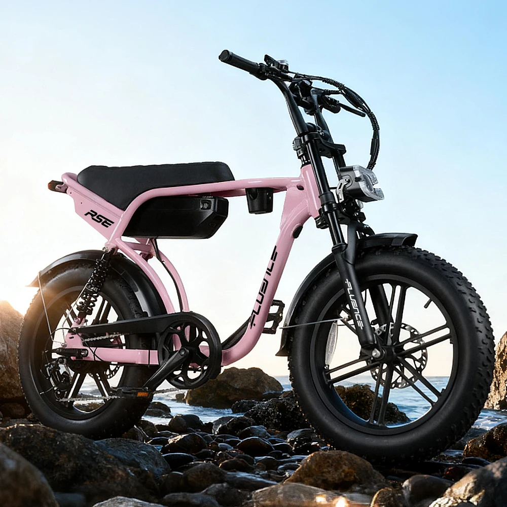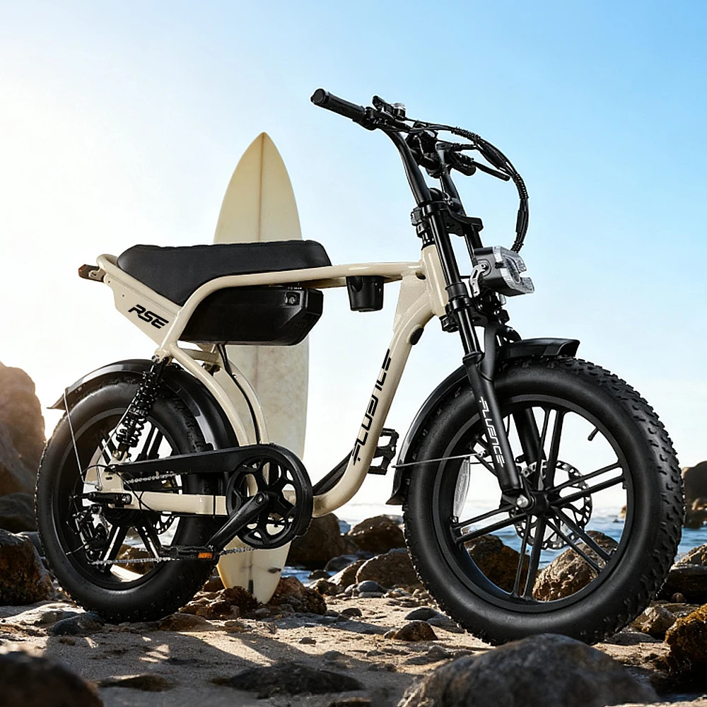 De Fluence RSE Fat Tire elektrische fiets levert krachtige prestaties en beklimt heuvels met gemak. Het verlengde zadel biedt gemakkelijk plaats aan twee personen en de gepersonaliseerde koplamp laat je opvallen. De 20×4.0 brede banden bieden veel grip op zand, sneeuw of grindwegen in de stad.