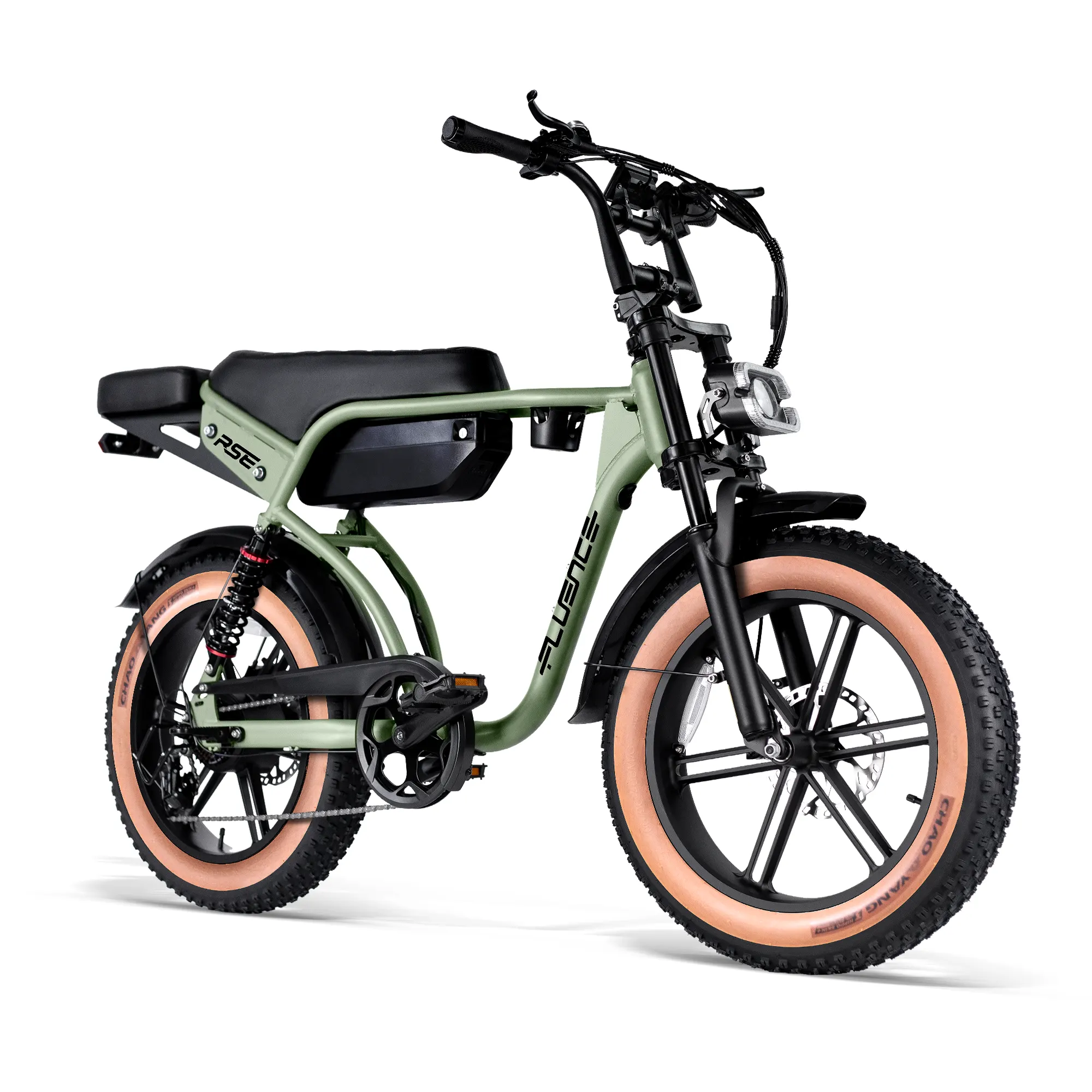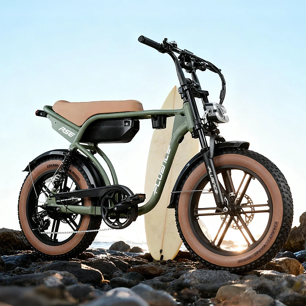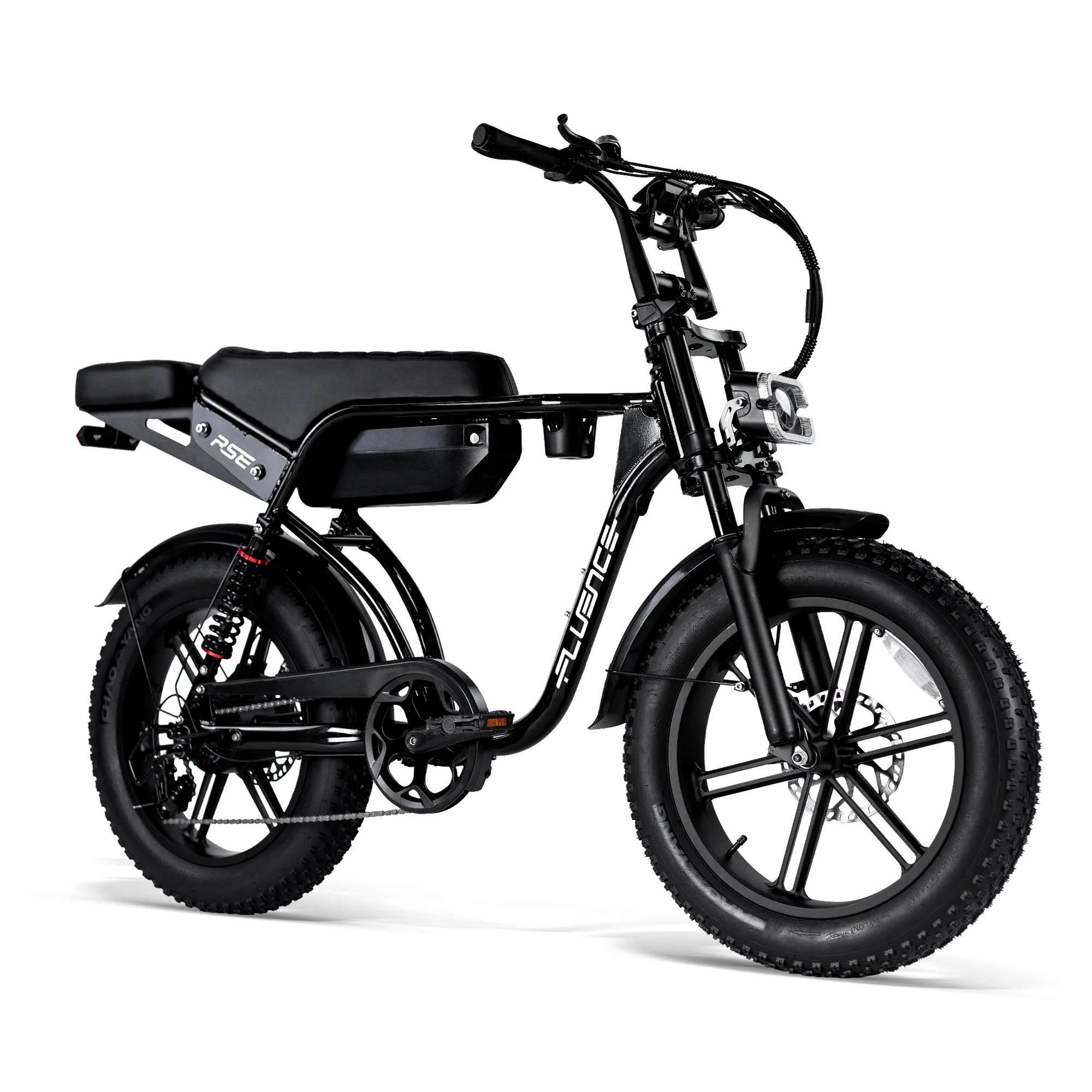 De Fluence RSE Fat Tire elektrische fiets levert krachtige prestaties en beklimt heuvels met gemak. Het verlengde zadel biedt gemakkelijk plaats aan twee personen en de gepersonaliseerde koplamp laat je opvallen. De 20×4.0 brede banden bieden veel grip op zand, sneeuw of grindwegen in de stad.